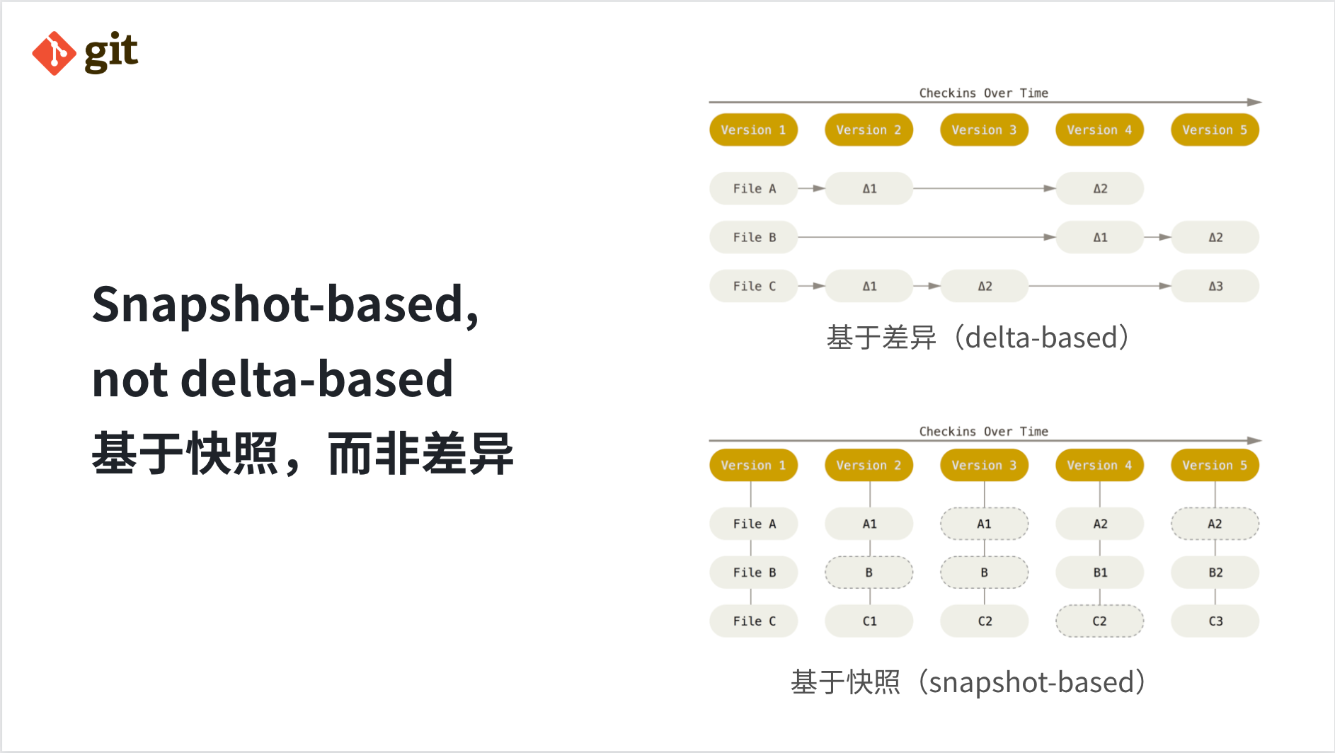 这其实是版本控制工具文件系统实现的两种思路:基于快照(snapshot-based)和基于差异(delta-based)。那么,已经知道答案的同学不要说出答案,大家再猜一猜,Git 是基于哪一种呢?