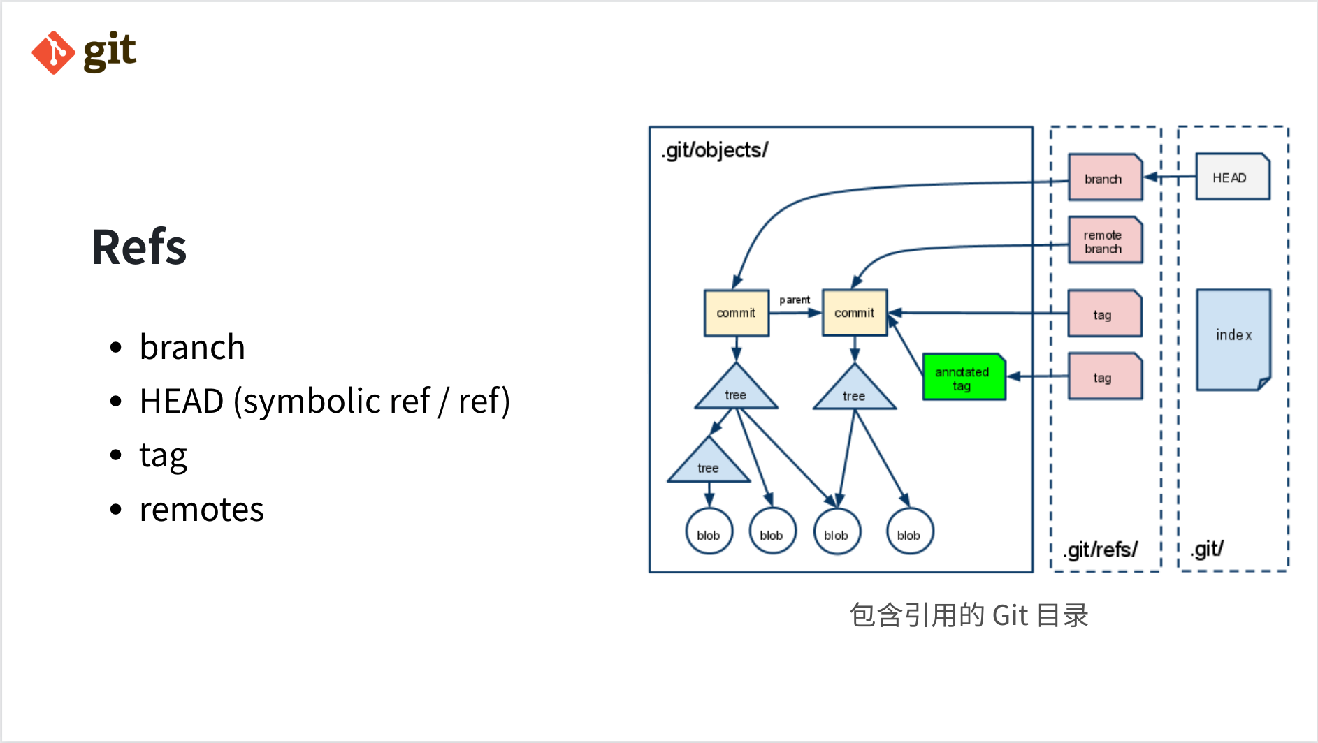 综上,一个 Git 仓库内部的引用和文件关系大致如图所示,图中的 index 是暂存区域,这里不去展开讲了。