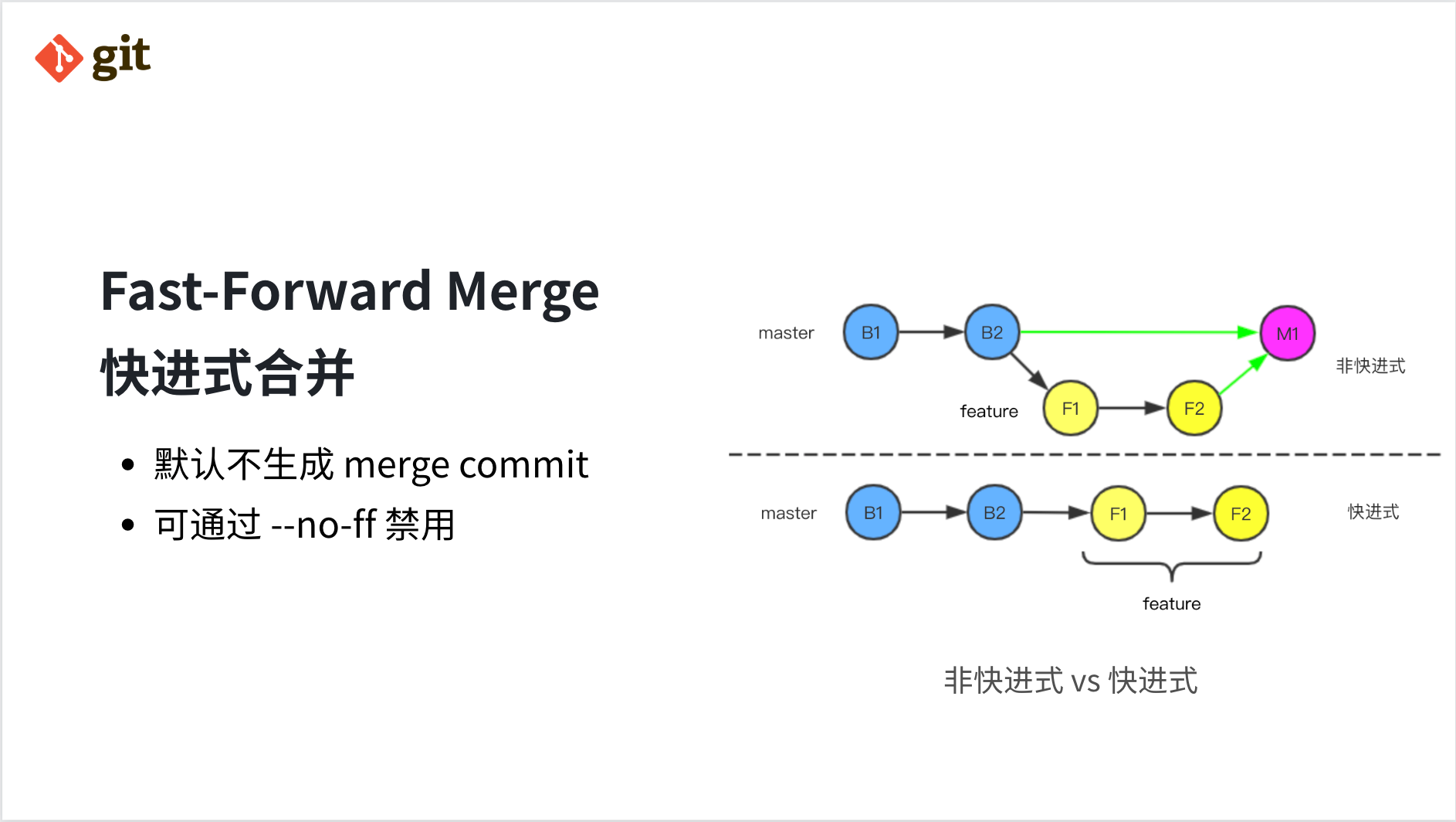 当合并的两个分支满足祖孙/父子关系时,Git 默认会使用快进式合并,最常见的场景是 pull,pull 的本质是 fetch + merge,由于一般在执行 pull 的时候远端分支相对本地分支是快进的,Git 可以直接合并,默认情况下不会产生 merge commit,但也可以通过参数 --no-ff 来禁止快进式合并。