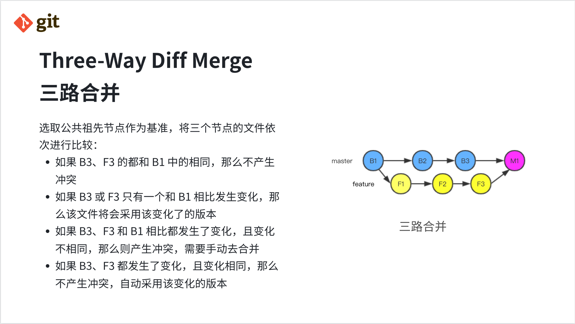 所以 Git 使用了更智能的三路合并算法,选取当前分支节点 B3 与目标分支节点 F3 的公共祖先节点 B1 作为基准(base),将这三个节点的文件依次进行比较:
