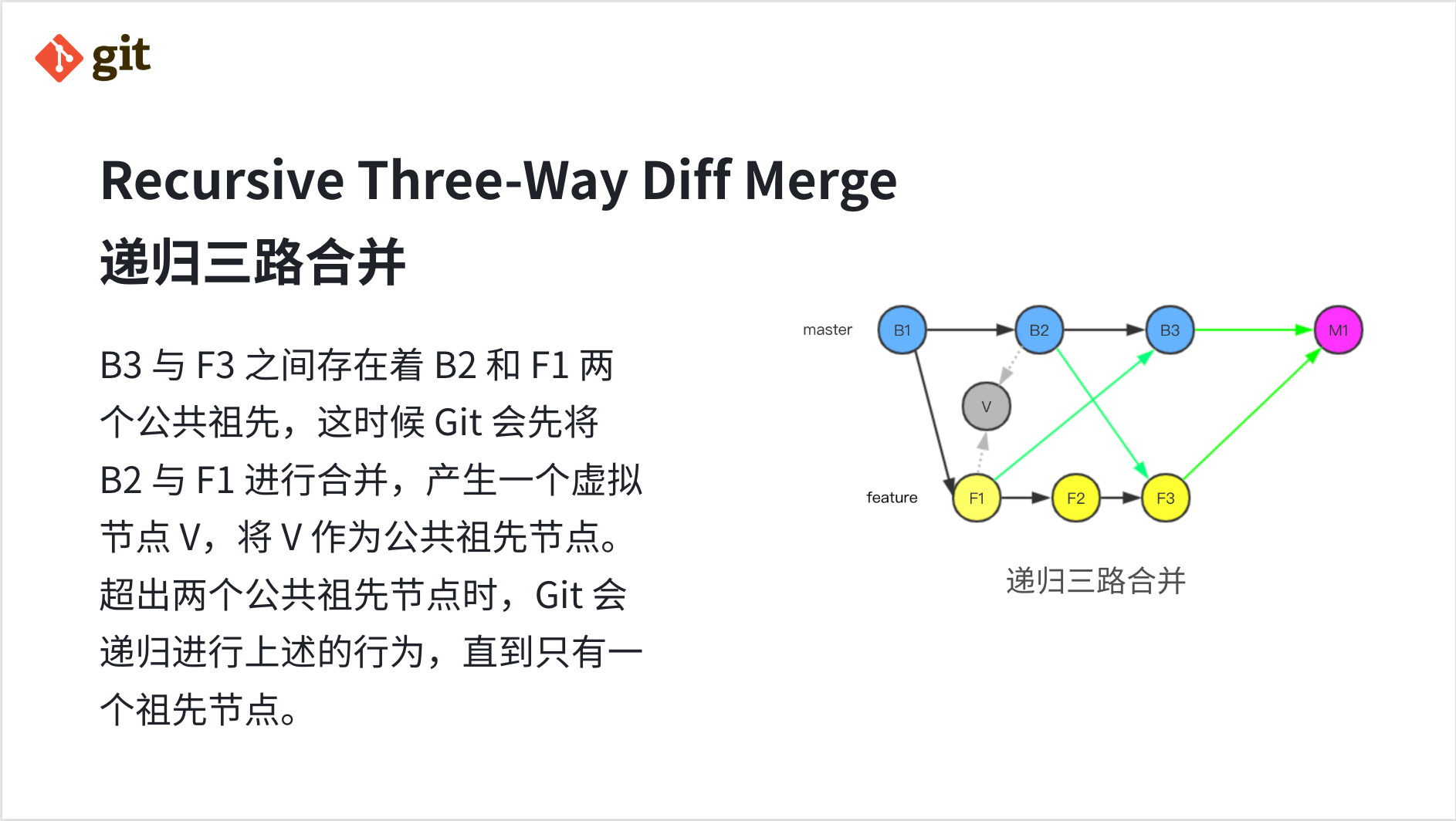 如图所示,B3 与 F3 之间存在着 B2 和 F1 两个公共祖先,这时候 Git 会先将 B2 与 F1 进行合并,产生一个虚拟的节点 V,将节点 V 作为公共祖先节点。