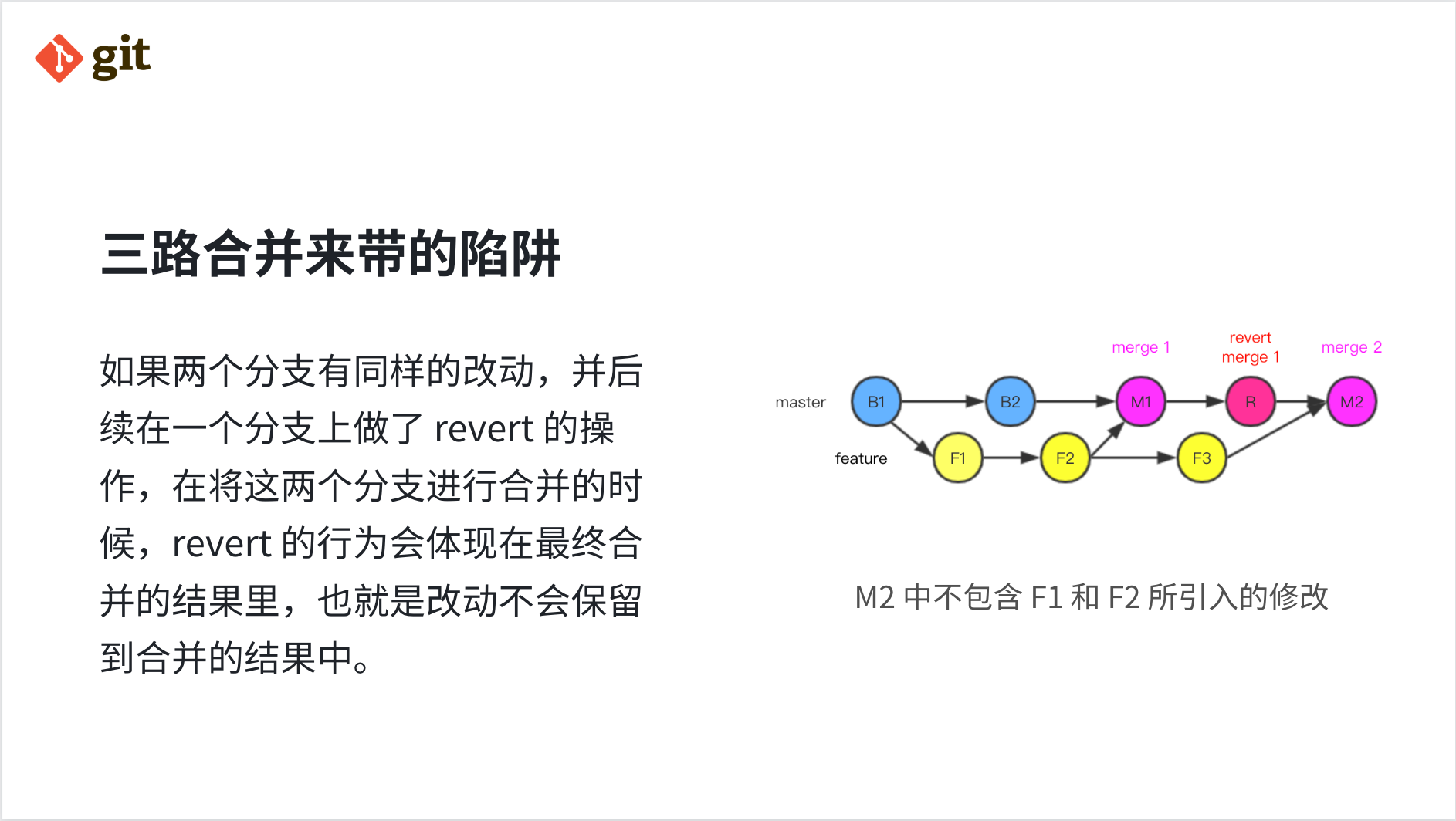 通过 git merge-base R F3 我们会发现第二次 merge 的最近公共祖先节点是 F2,而已经不再是 B1,第一次 merge 改变了特性分支与主分支最新节点之间的最近公共祖先节点,根据三路合并算法的原理,F1 F2 的代码在公共祖先节点 F2 以及 F3 上是一致的,那么在主分支上所做的 revert 修改将会被带入最终的 merge 2。