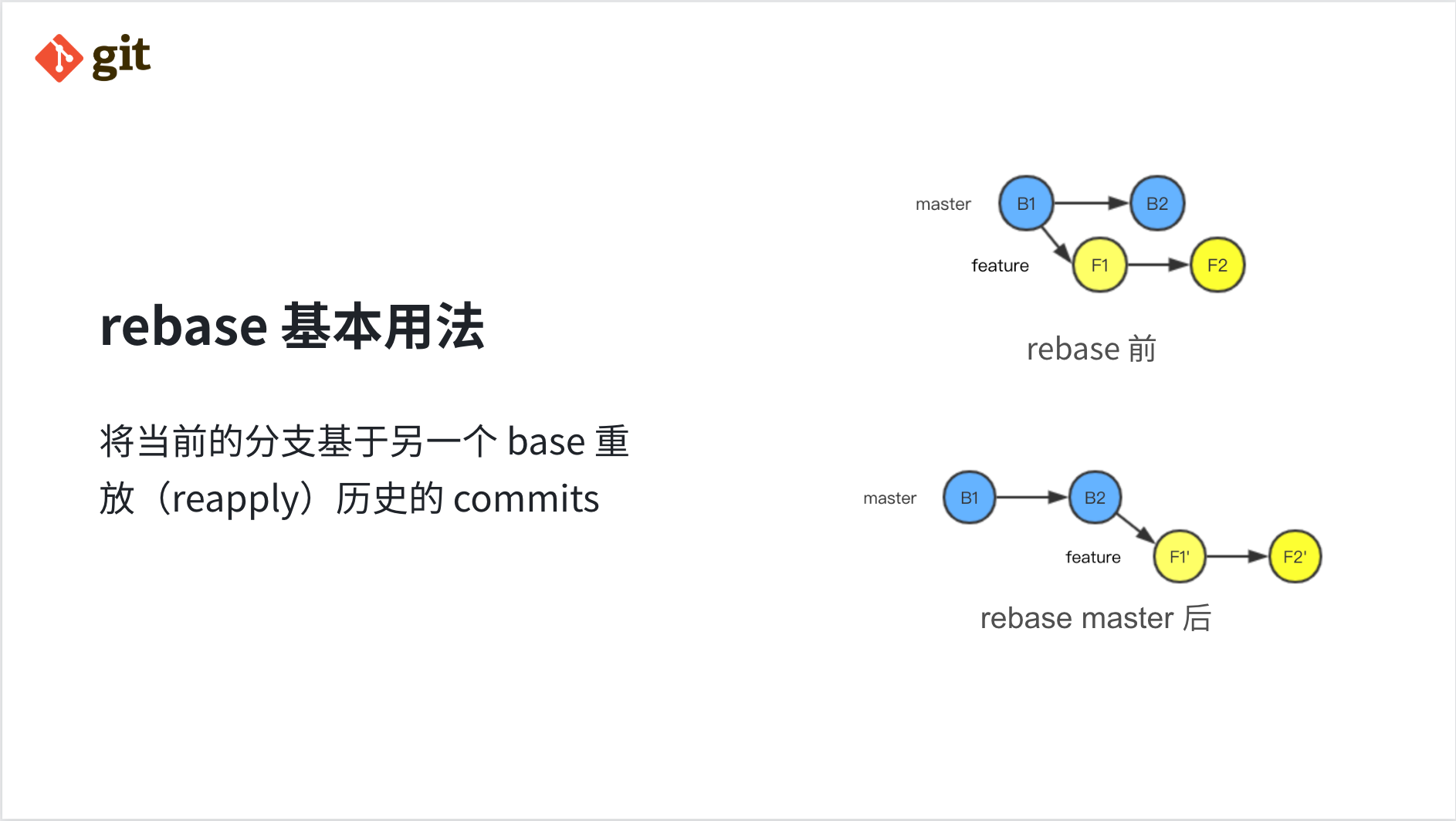 刚刚说的常见场景是将当前的分支基于另一个 base 重放(reapply)历史的 commits,以 git 文档中的例子进行解释,当前我们有两个分支,master 与 feature,并且当前我们在 feature 分支上,在执行 git rebase master 后,将变成图中下方所示。