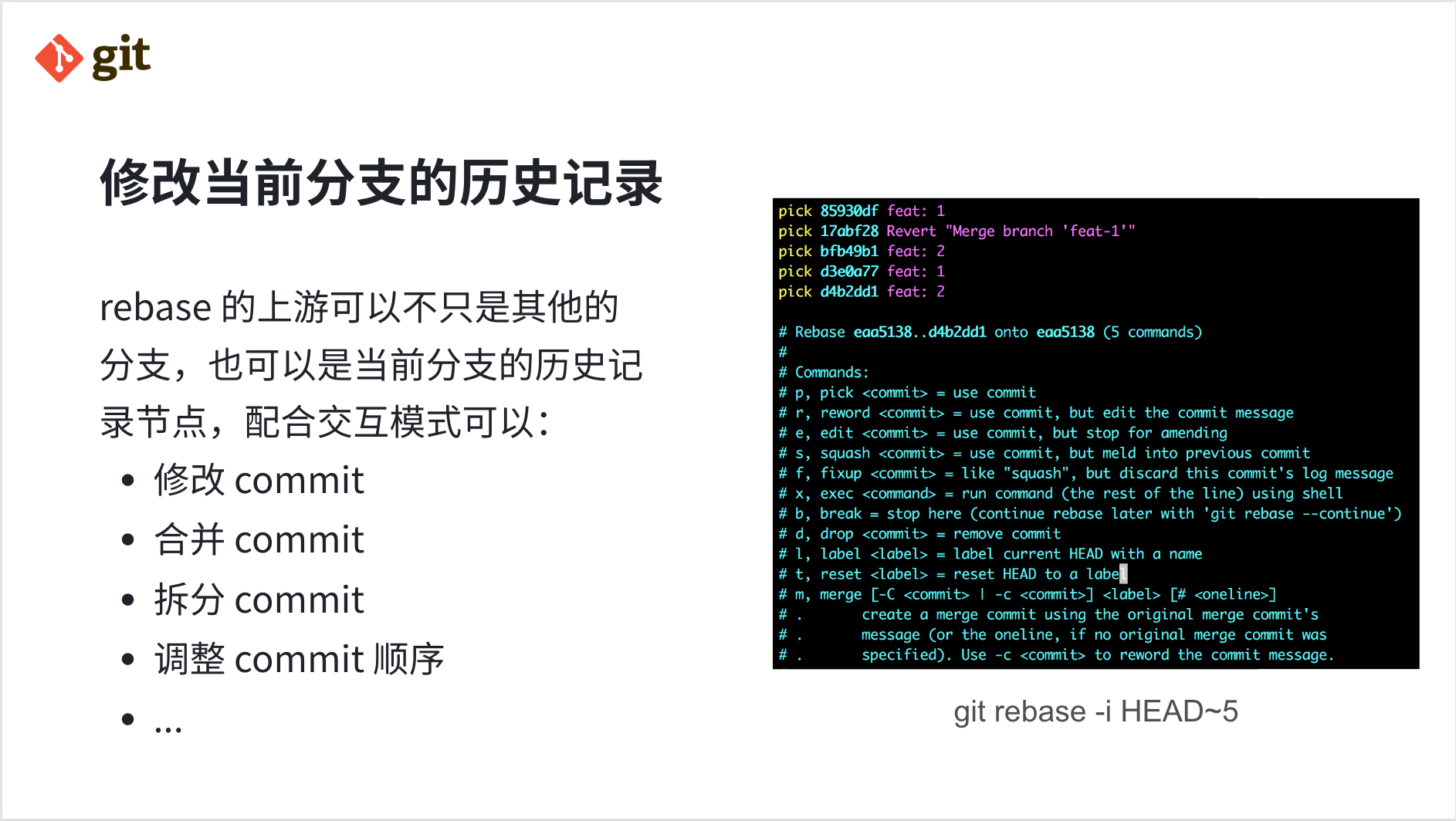 在 Git 中并不存在一个专用的修改历史的命令,但我们可以借助 rebase 来修改历史。这里 rebase 的上游可以不只是其他的分支,也可以是当前分支的历史记录节点,配合 rebase 的交互模式,可以实现重写当前分支的历史:修改 commit、合并 commit、拆分 commit、调整 commit 顺序等等。